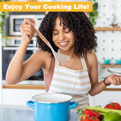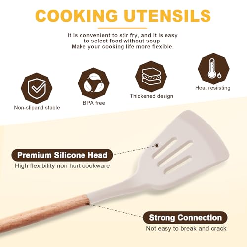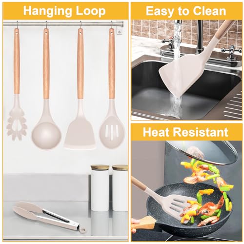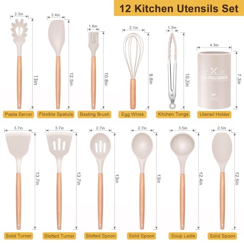 12 Piece Kitchen Utensil Set, Silicone Kitchen Utensils Set, Non-Stick Heat Resistant Wooden Handle Cooking Cutlery with Utensil Holder, Silicone Spatula Cookware Set, Dishwasher Safe (Khaki)