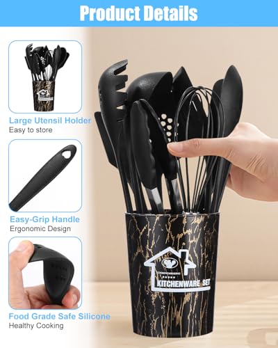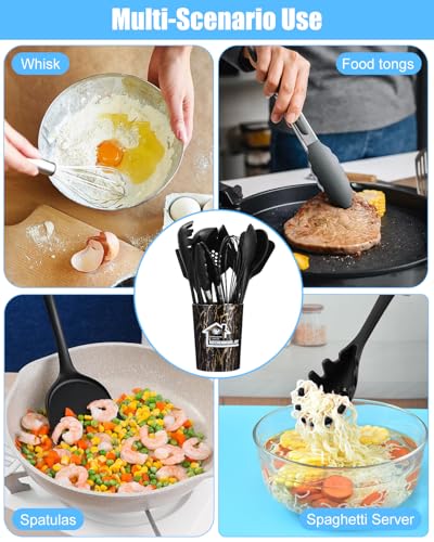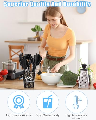 Straightforward to scrub and retailer: this kitchen utensil set has a easy floor that makes it very straightforward to scrub, and it may be washed within the dishwasher after use, saving effort and time. And the hanging loop on the finish of the deal with makes it straightforward to hold on a kitchen hook, as well as, it comes with a storage utensil holder that may be positioned on the countertop to maintain your kitchen tidy and arranged. Word: For higher care, dry with a towel instantly after cleansing and retailer in a dry place.