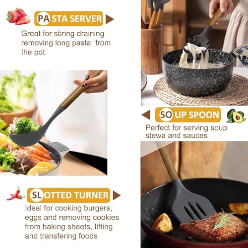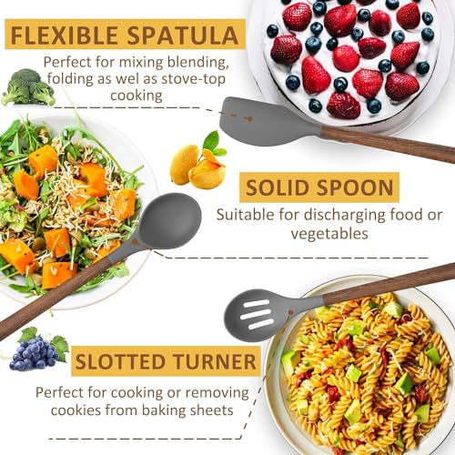 8-Piece Kitchen Utensil Set, Silicone Kitchen Utensils, Cooking Spoon Set with Wooden Handle and Hole for Cooking and Baking, Non-Stick Heat Resistant Kitchen Aid, Whisk, Spatula (Grey)