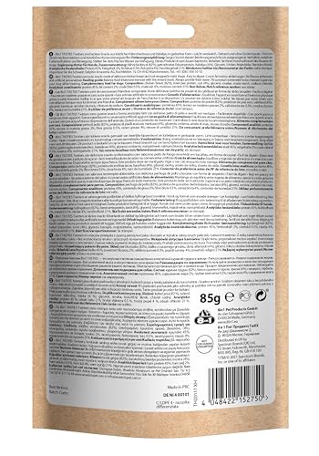 No flavour enhancers, genetically modified organisms, synthetic preservatives and dyes. Field contents: 1 x 85 g 8in1 Tasties Twisters chew sticks