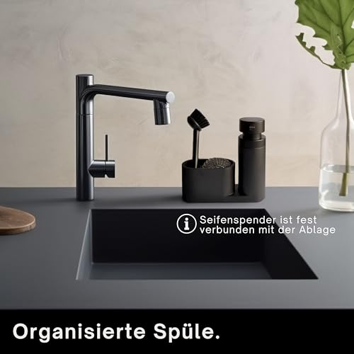 WITH BRUSH AND SPONGE – Matte black kitchen organizer with brush and sponge. The cleaning soap dispenser is firmly related to the tray