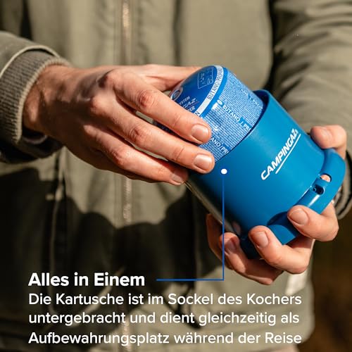 Easy handling: The stitch gas cartridge can be easily inserted into the cooker, then the housing is screwed, the plastic bell ensures stability and protects the cartridge