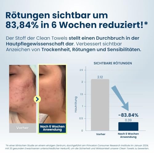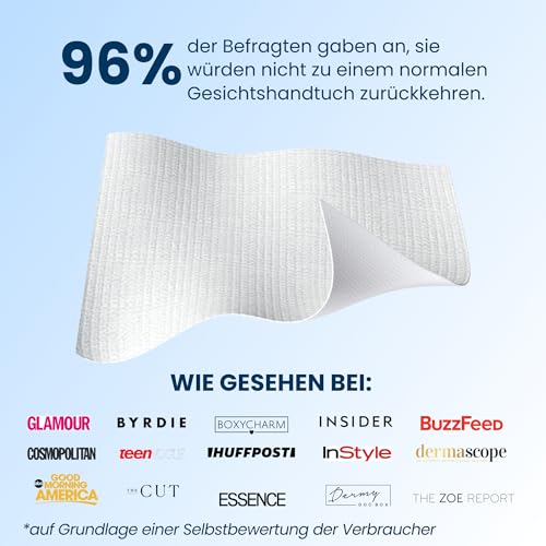 Die Tücher sind dermatologisch getestet, helfen sichtbar bei klarerer Haut, reduzieren Irritationen und Rötungen und sind immer sauber und keimfrei.