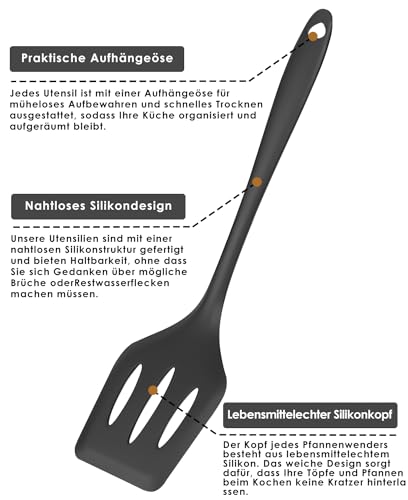 Safe and environmentally friendly materials: made of high-quality silicone, our kitchen utensils guarantee the safety of your cookware with their scratch-resistant design. Made from food grade silicone, they are heat resistant up to 210°C/450°F and offer you a peace of mind when cooking. The small hole at the end of each handle allows for easy hanging and keeps your kitchen organized and tidy.