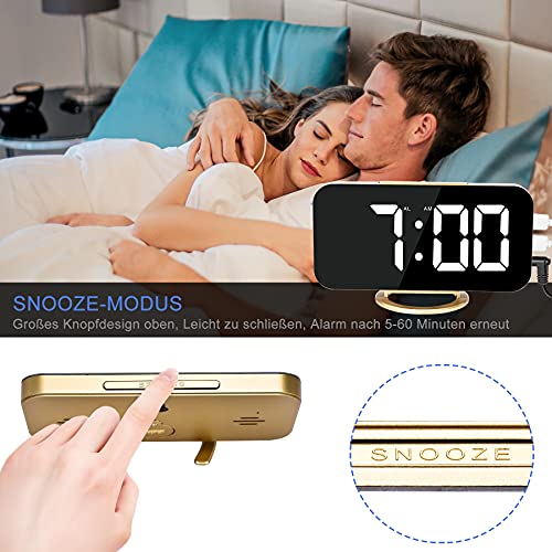Digital Bedside Alarm Clock with 7-Inch LED Mirror, 2 USB Charging Ports, Snooze Mode, Automatic Brightness Adjustment, Easy to Set Up Desk Clock for Home Office Kitchen, Gold