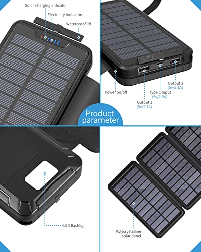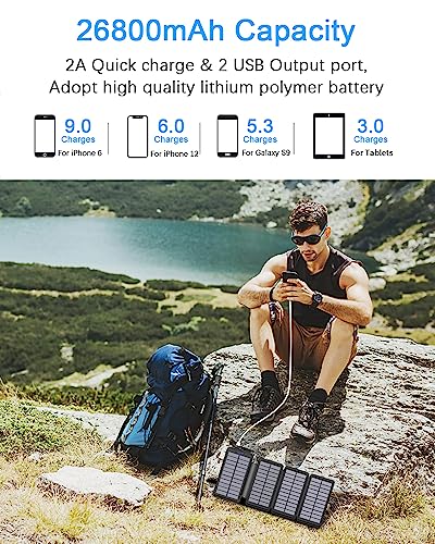 26800 mAh solar power bank: This solar charger can charge 6 times for iPhone XS, 4.5 times for Galaxy S9 Plus, 2 times for tablets. No more worrying about running out of power, great choice for hiking, camping, travel and other outdoor activities.