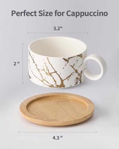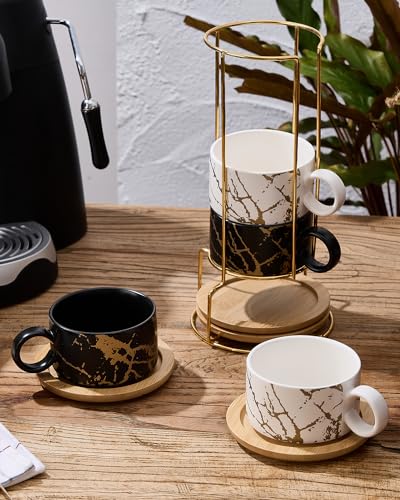 HOME DECOR Cappuccino Tassen Set – 4 x 180 ml Kaffeetassen mit Unterteller & Ständer – Edle Keramik Tassen für Espresso, Cappuccino und Latte – Marmor Kollektion