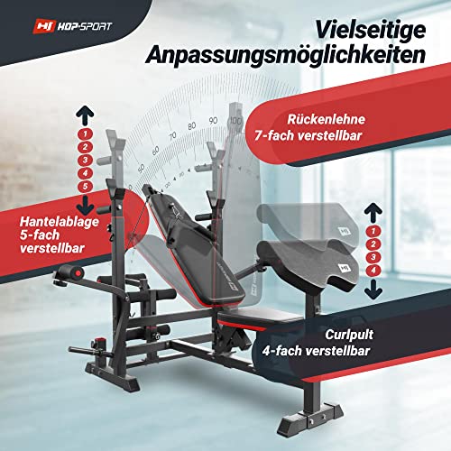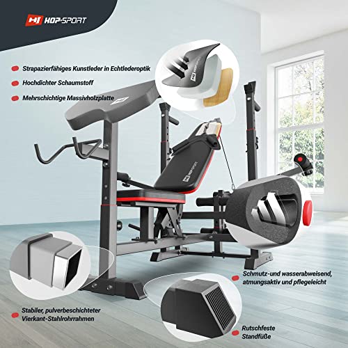 Die Hop-Sport HS-1075 Gewichtsbänke verfügen über eine solide Stahlkonstruktion, eine hohe maximale Belastbarkeit von 280 kg, ein bequemes Polster aus hochwertigem Kunstleder und verstellbare Elemente wie eine 4-fach verstellbare Curl-Stange und eine 7-fach verstellbare Rückenlehne.