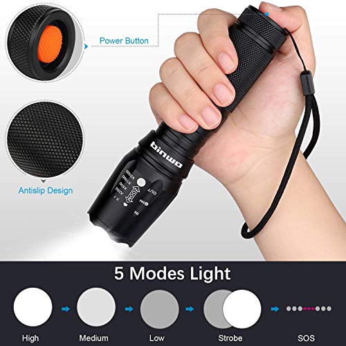 Die Binwo LED Taschenlampe bietet fünf Lichtmodi: Hoch, Mittel, Niedrig, Strobe und SOS.