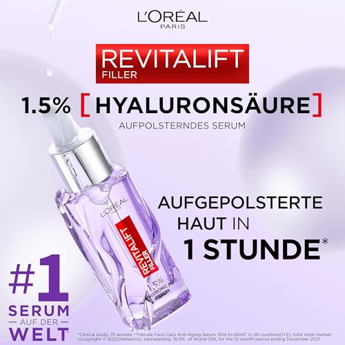 Contents: 1 x L’Oréal Paris Revitalift filler anti-ageing serum in opposition to wrinkles, with concentrated hyaluronic acid, 30 ml.