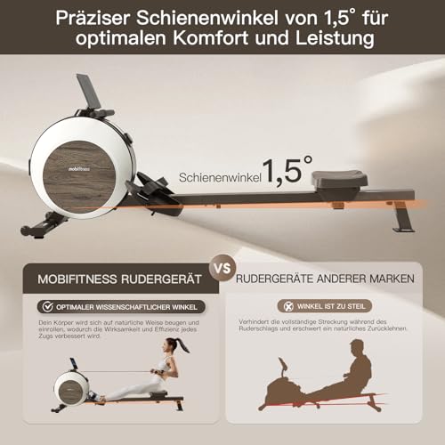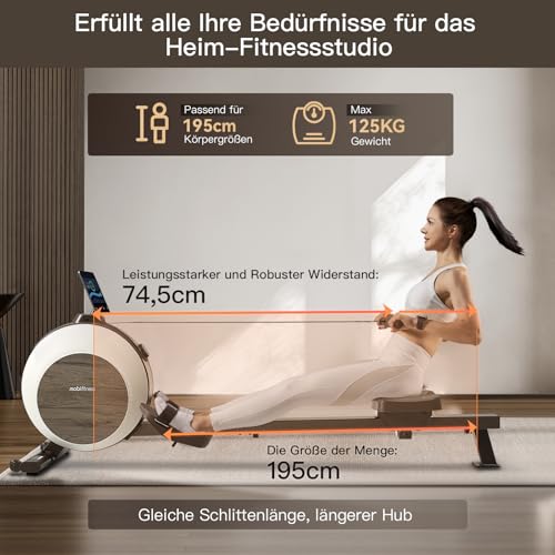 MOBI FITNESS Luka Home Rowing Machine, Bluetooth Rowing Machines with 32 Resistance Levels, Standard Legs, Maximum Load Capacity of 120 kg, Vertical Storage, Space Saving