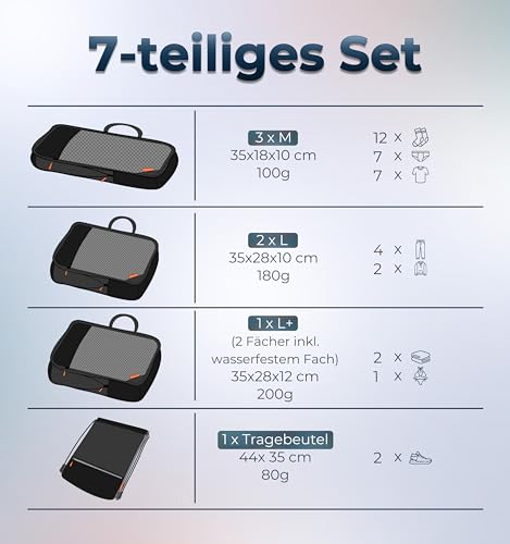 Appropriate for suitcases and backpack: The coordinated packing dice compression set is designed for journey with a hand baggage case (70 x 50 x 30 cm) or backpack (70 litres) – your journey organiser when travelling