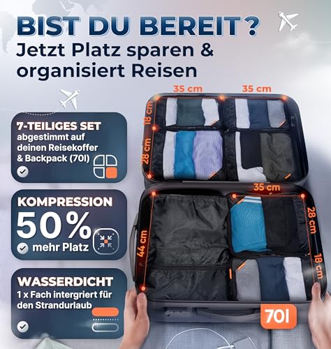 Suitable for suitcases and backpack: The coordinated packing cube compression set is designed for travel with a hand luggage case (70 x 50 x 30 cm) or backpack (70 litres) – your travel organiser when travelling
