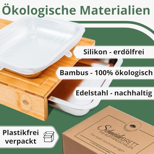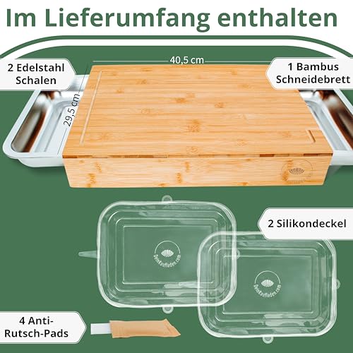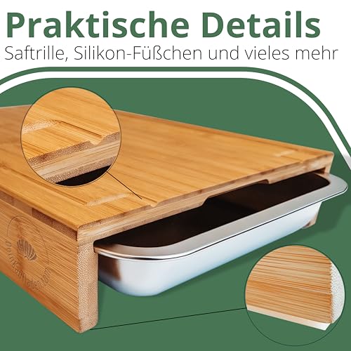 Das Premium Holzschneidebrett besteht aus robustem Bambus und verfügt über praktische Krümelschalen und Silikondeckel, die das Arbeiten in der Küche erleichtern.